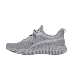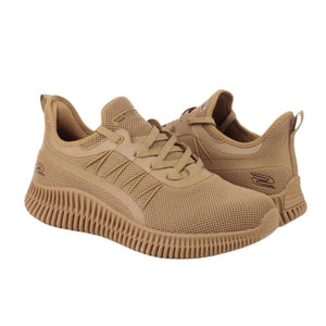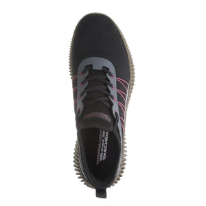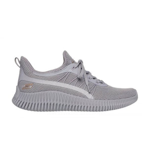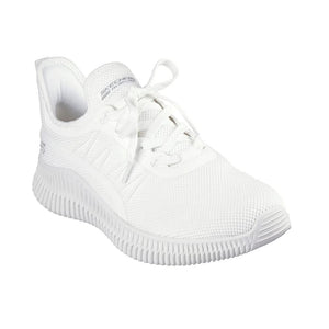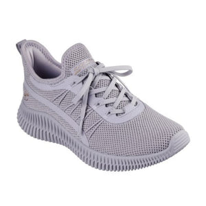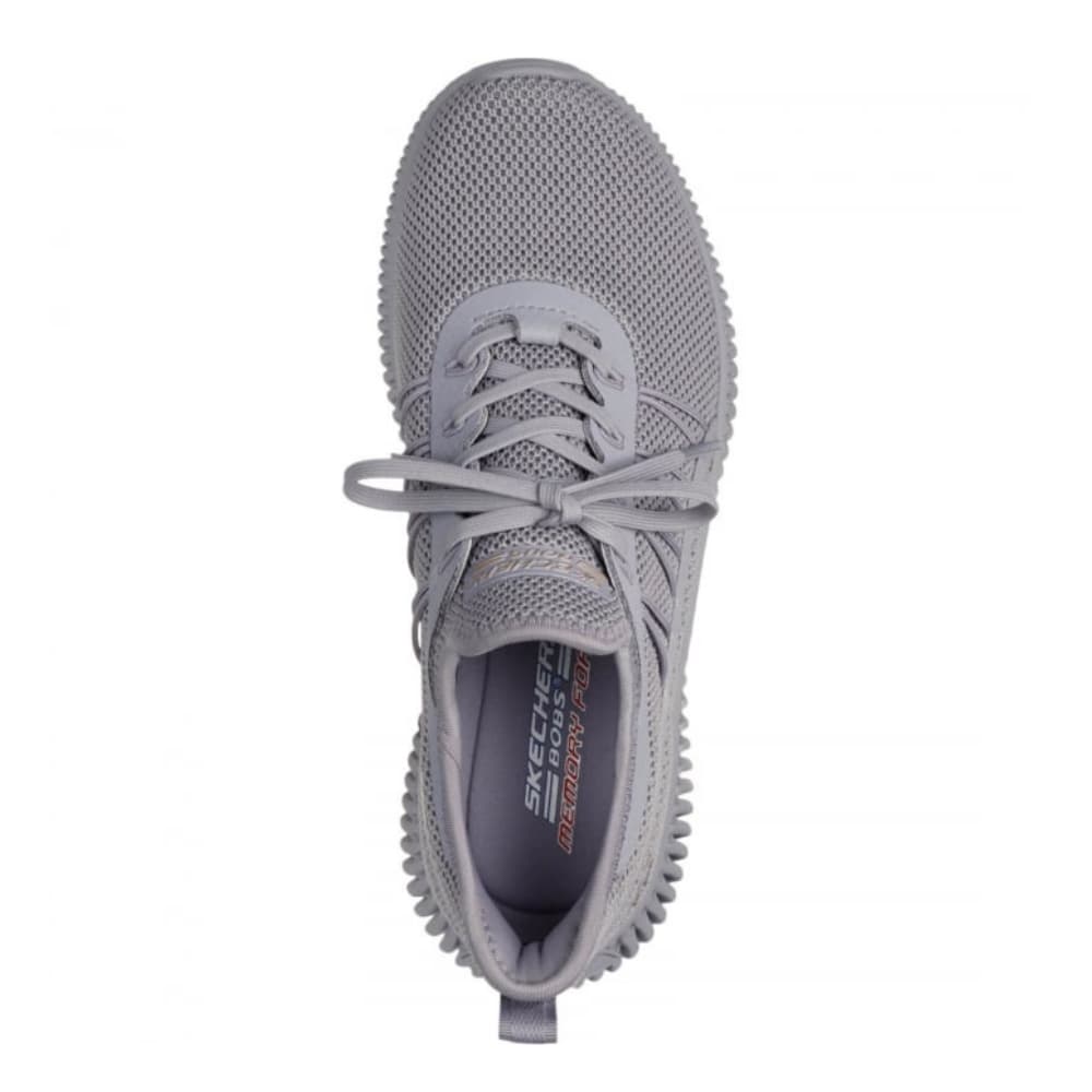 Stand out in feel good style that gives back wearing BOBS from Skechers™ - BOBS Geo. This on-trend vegan style features an engineered knit upper with quarter webbing, a stretch-lace front, ribbed midsole, and Skechers Memory Foam™ insole cushioning.