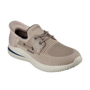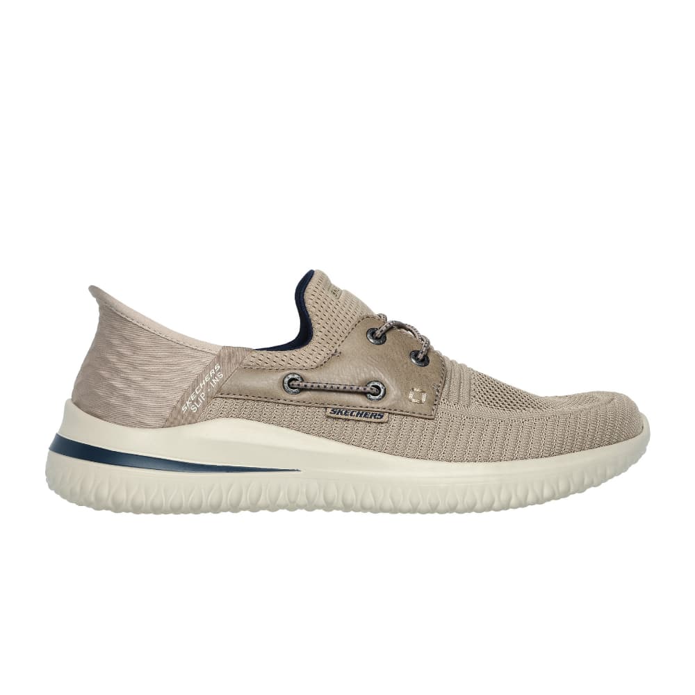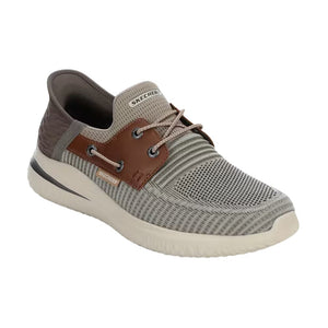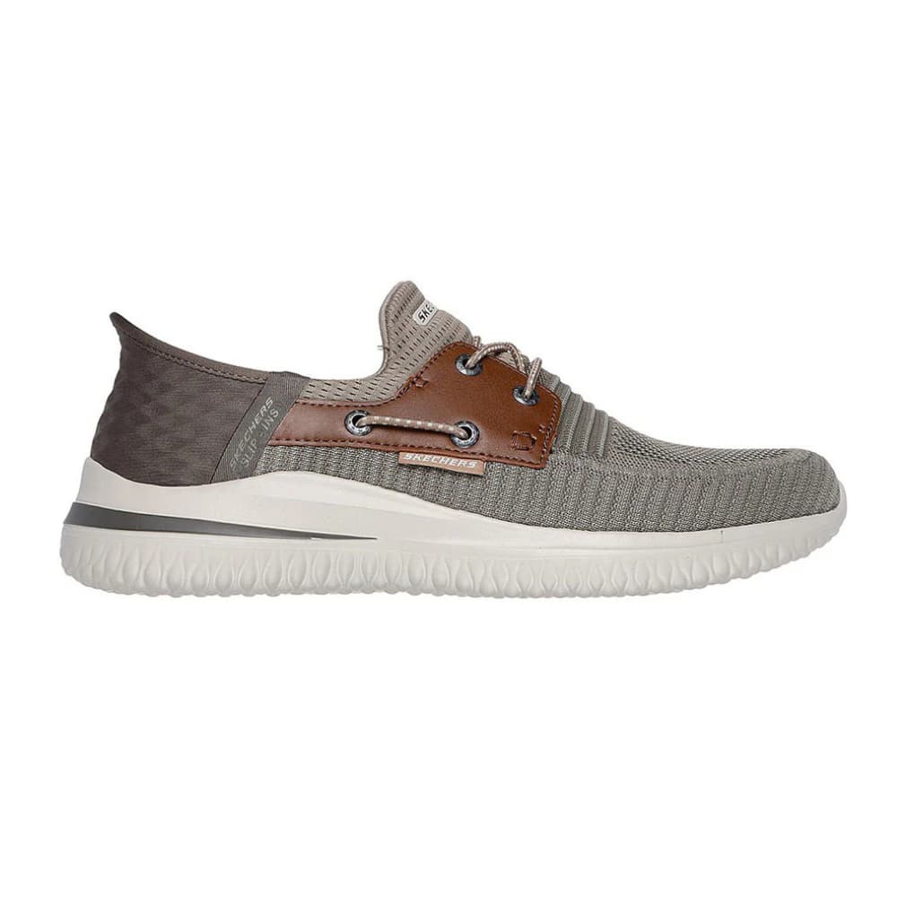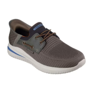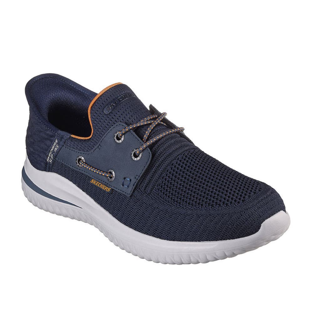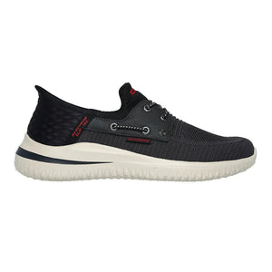 Simply step in and go wearing Skechers Hands Free Slip-ins®: Delson 3.0 - Roth. Designed with our Heel Pillow®, this slip-on boat style features an engineered knit and synthetic upper with stretch laces, a Skechers Air-Cooled Memory Foam® comfort insole, and Goga Mat Arch™ cushioning for added support.