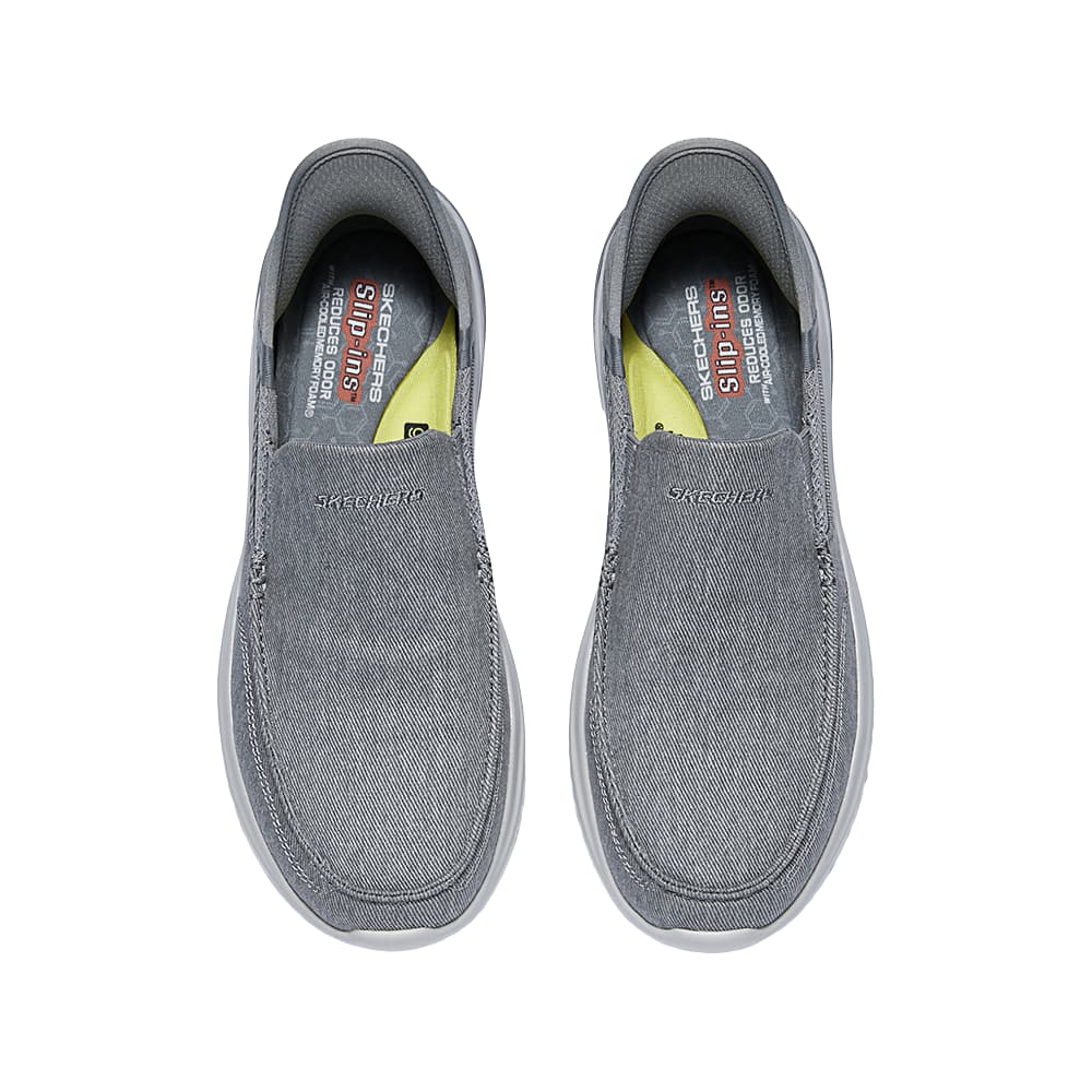 Simply step in and go wearing Skechers Hands Free Slip-ins®: Delson 3.0 - Cassell. Designed with the brand's exclusive Heel Pillow™, this slip-on style features a Classic Fit canvas upper, charcoal infused Skechers Air-Cooled Memory Foam® comfort insole to neutralize potential odour, and Goga Mat Arch™ cushioning for added support.