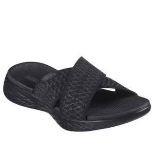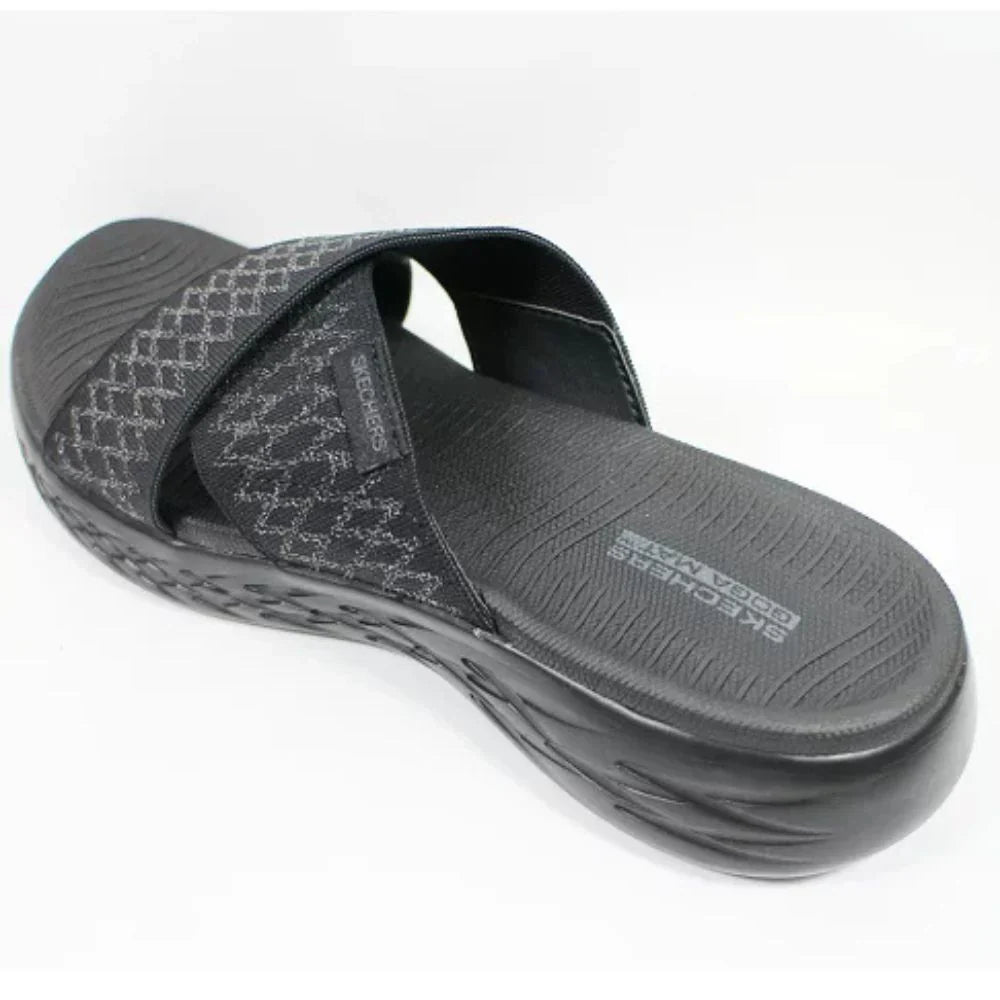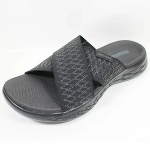 Warm weather style arrives with enhanced comfort in Skechers On-the-GO® 600 - Enchanted. This slide sandal features a Stretch Fit® metallic knit crossband upper with lightweight 5GEN® cushioning and a contoured Goga Mat® comfort footbed.