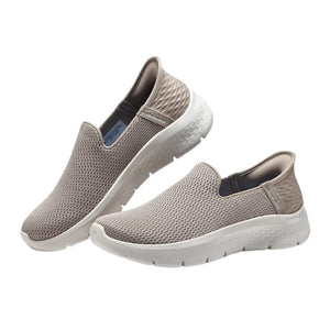Step-in to convenient walking comfort and cushioning wearing Skechers Hands Free Slip-ins™ GO WALK® Flex - Relish. This laceless design features a breathable athletic mesh upper, our exclusive Heel Pillow™, a Skechers Air-Cooled Memory Foam® insole, lightweight ULTRA GO® cushioning and Flex Pillars™ for added support.