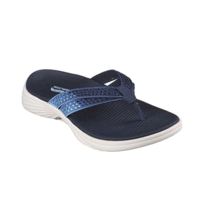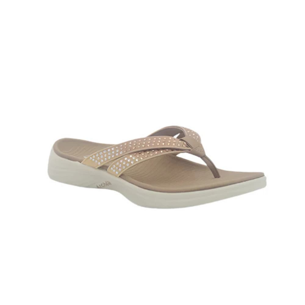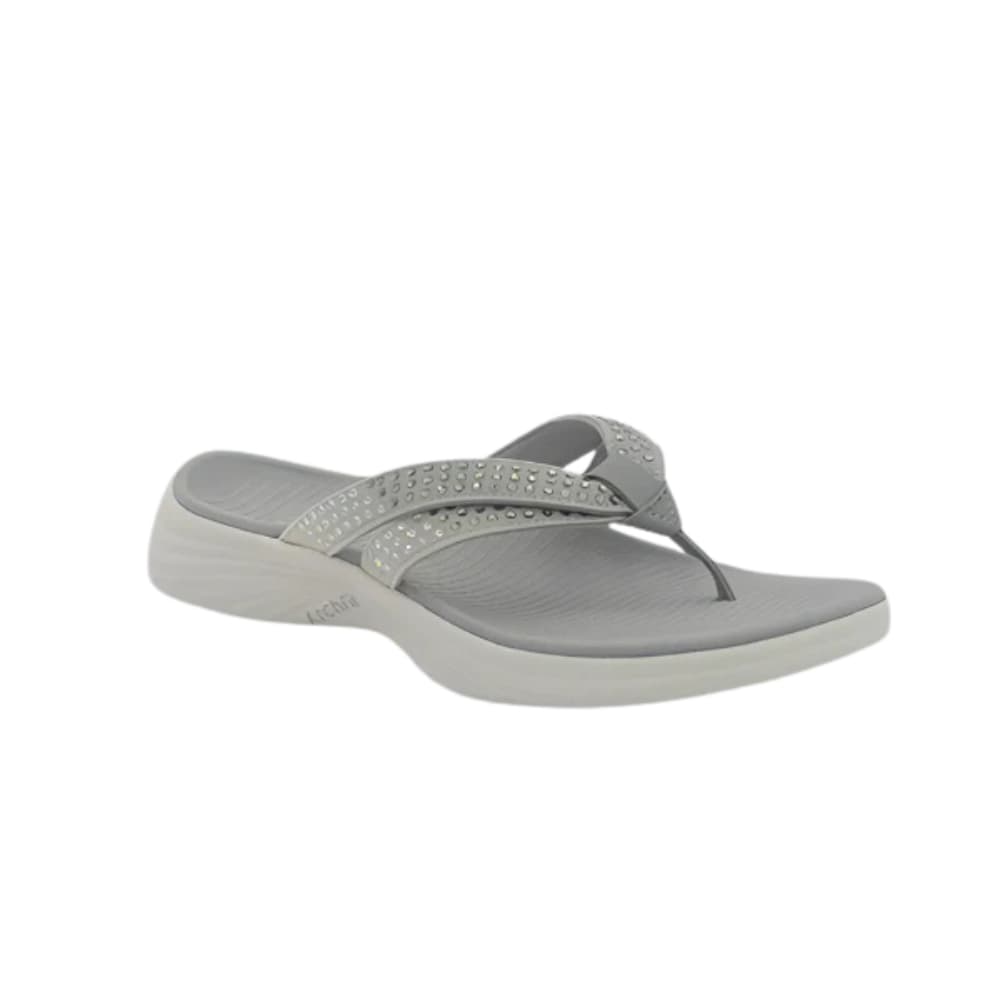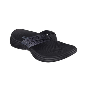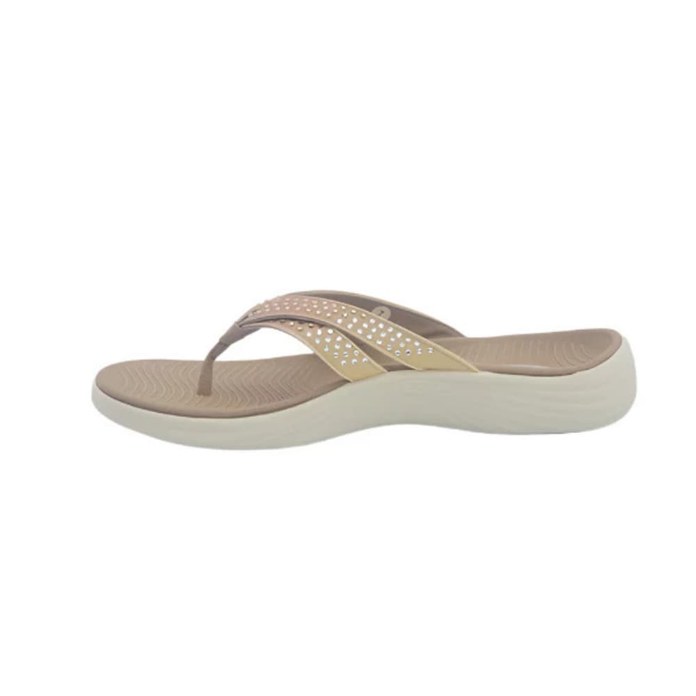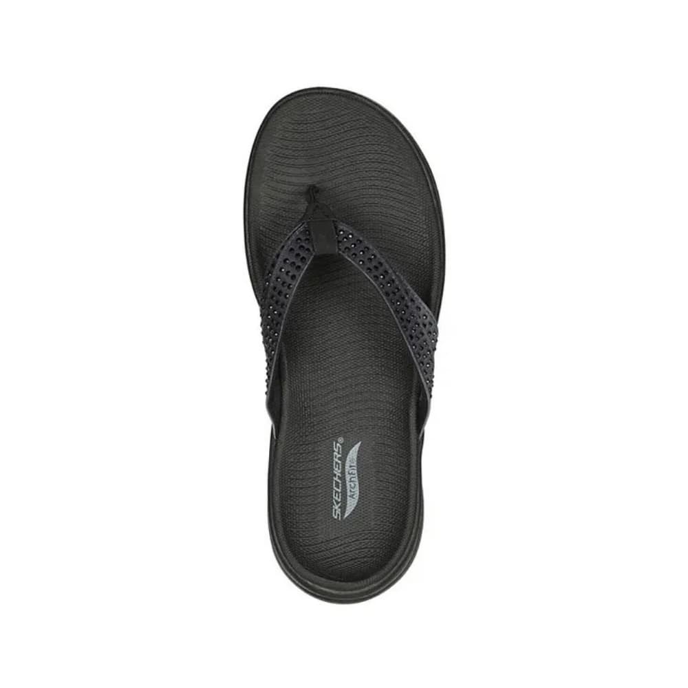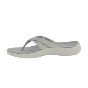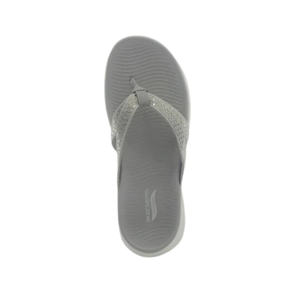 This Arch Fit® designed sandal features a rhinestone embellished woven fabric upper with a contoured Goga Mat® footbed and lightweight ULTRA GO® cushioning.