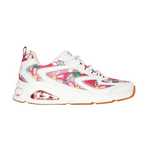 Skechers Women's 17748 Uno Ricardo Cavolo Spring Bloom: Collaborated with artist Ricardo Cavolo, these sneakers feature a 'Blossoms' printed mesh upper and synthetic overlays, beautifully telling a meaningful story. The lace-up design and visible airbag midsole provide comfort and support, while the flexible outsole offers traction. Add these to your collection and feel inspired every step of the way!