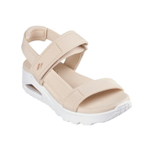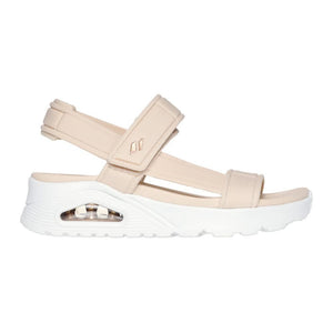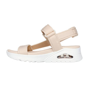 Warm up the season in style with Skechers Uno - Summer Stand2. This T-strap sandal inspired by our iconic Uno silhouette features a synthetic durabuck upper with an adjustable back strap. This design is complemented by a cushioned Yoga Foam® and a visible Skech-Air® airbag midsole.