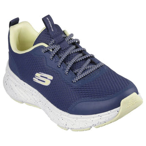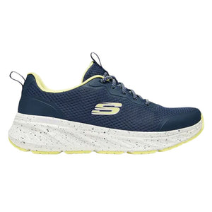 Enjoy well-cushioned performance while minding your footprint wearing Skechers Relaxed Fit®: Edgeride - Smooth Journey in Navy and lime. Designed with recycled materials, this vegan athletic style features a mesh upper with synthetic overlays, stretch laces, a well-cushioned midsole, and a Skechers Air-Cooled Memory Foam® insole. Our Planet Matters®: Good for your feet. Good for the world.®